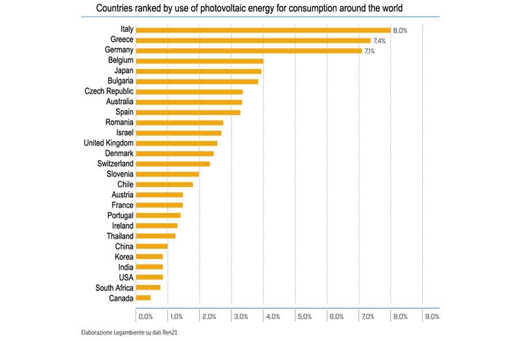 The report shows that Italy is ahead of Germany and Greece and other front runners in the use of solar power, by providing 8.1 per cent of its population with electricity from this power source.