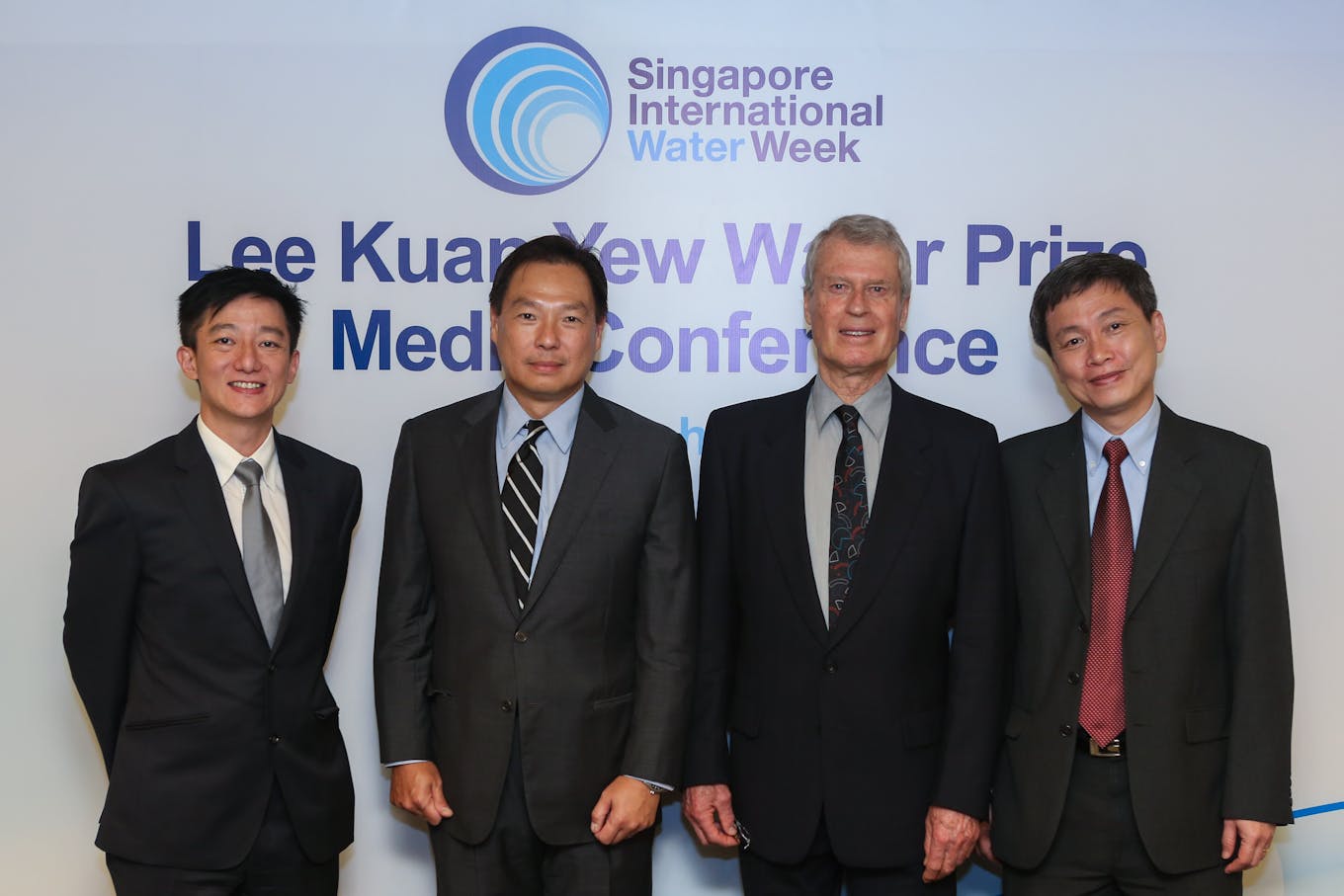 From left: Bernard Tan, managing director of Singapore International Water Week; Ng Joo Hee, chief executive of PUB; Prof John Anthony Cherry, Lee Kuan Yew Prize 2016 Laureate; and Harry Seah, chief engineering and technology officer of PUB. Image: Singapore International Water Week
