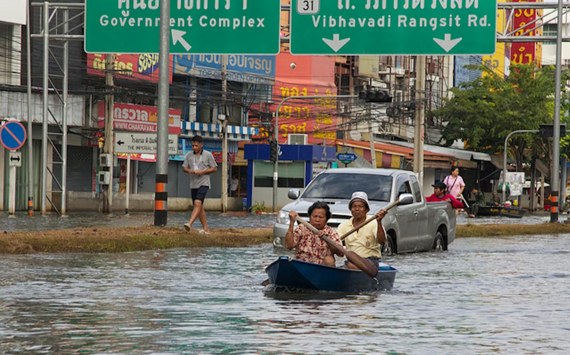 A couple paddle through a flooded road in Bangkok, Thailand. Journalists in South and Southeast Asia say interest in climate change wanes after the effects of extreme weather subside. Image: ebvImages CC BY-NC-ND 2.0