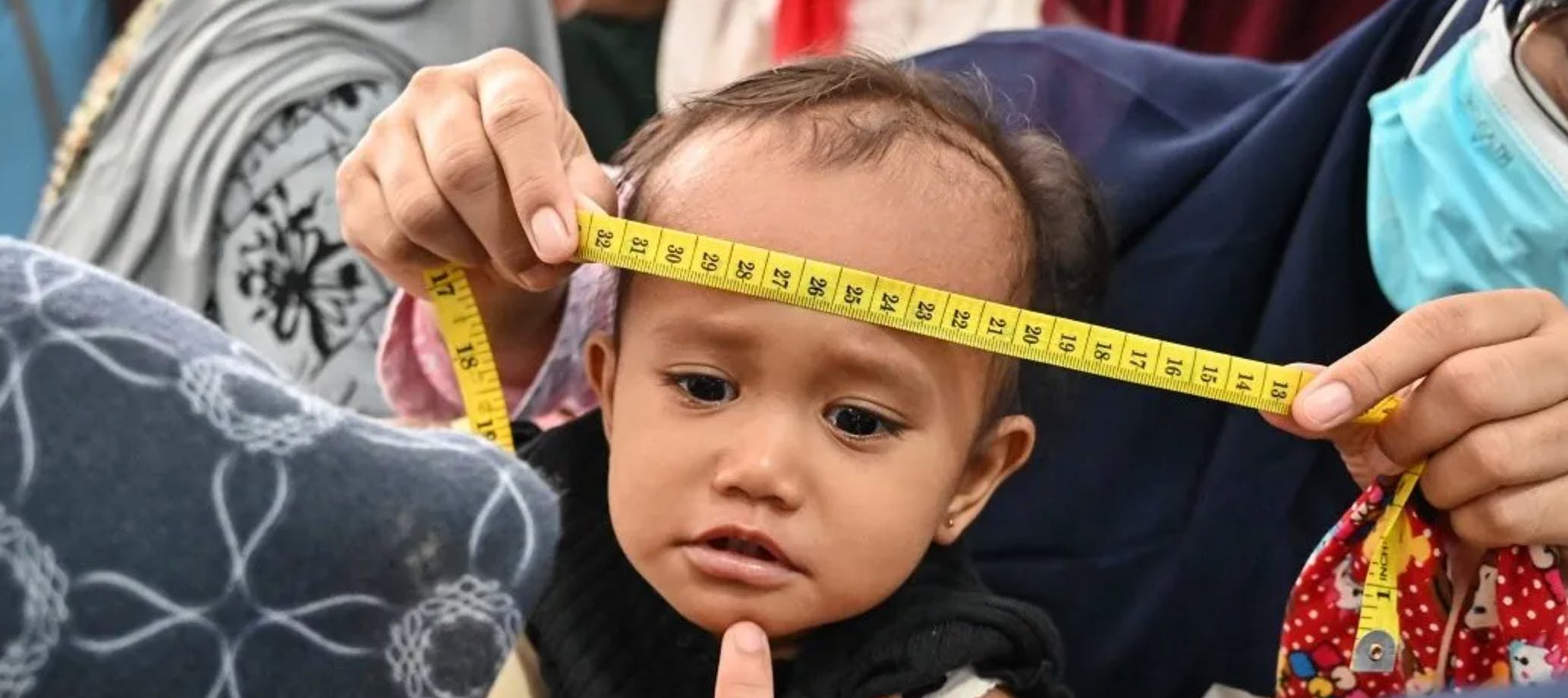 A child's growth measurements are taken as part of a monthly medical check-up programme for children at an integrated services post in Banda Aceh on August 10, 2023. Image: CHAIDEER MAHYUDDIN / AFP