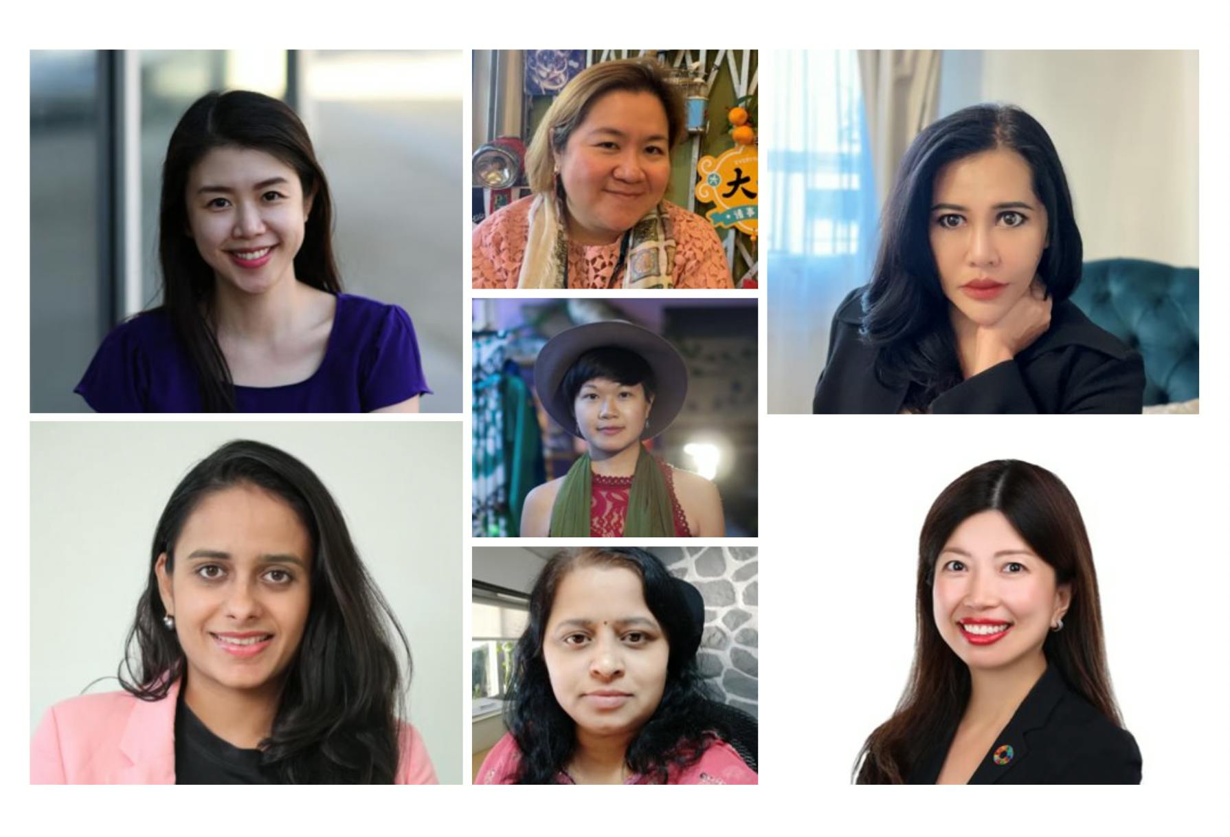 Clockwise, from top left: Maggie Lee of World Wide Fund for Nature, Wilmar sustainability head Perpetua George, forestry sustainability consultant Aida Greenbury, Global Green Connect founder Christina Lee, Godrej & Boyce sustainability head Tejashree Joshi, Upcycler’s Lab founder Amishi Parasrampuria; Centre: Huiying Ng, co-founder, Foodscape Collective and doctoral researcher in agroecology.