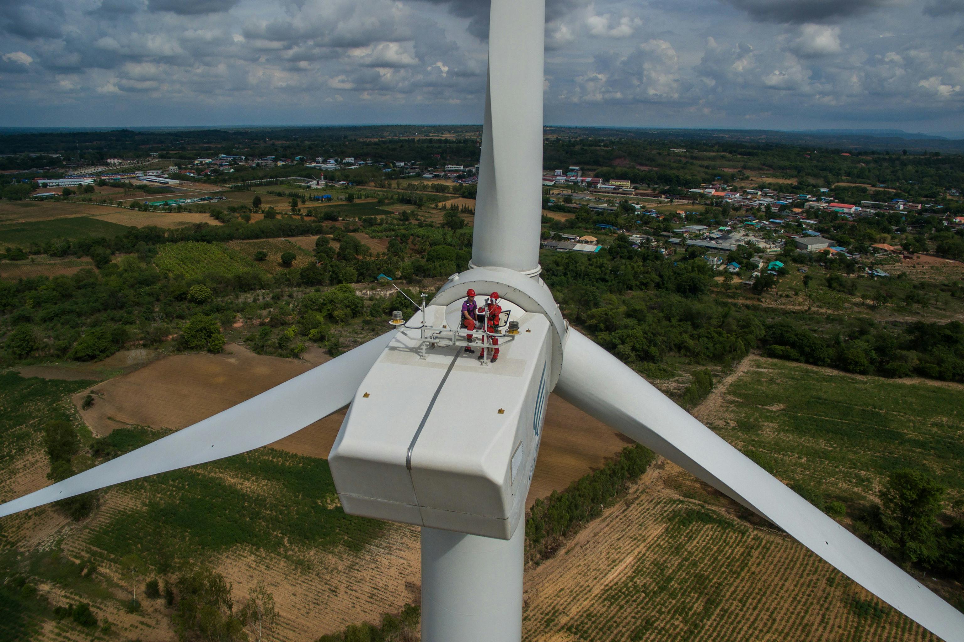 Men working on a wind turbine at the Theppana wind farm in Chaiyaphum province, Thailand. Image: , CC BY-SA 3.0, via Flickr.