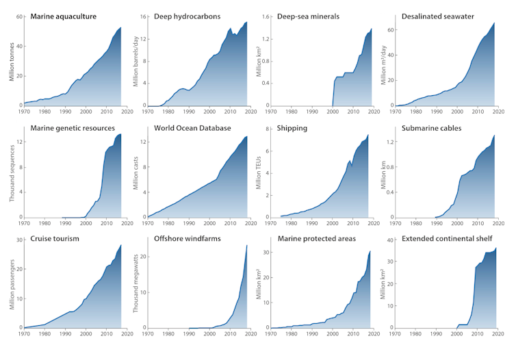Human claims on ocean resources and space have increased rapidly in the last three decades. Image: Jouffray et al. (2020)Author provided
