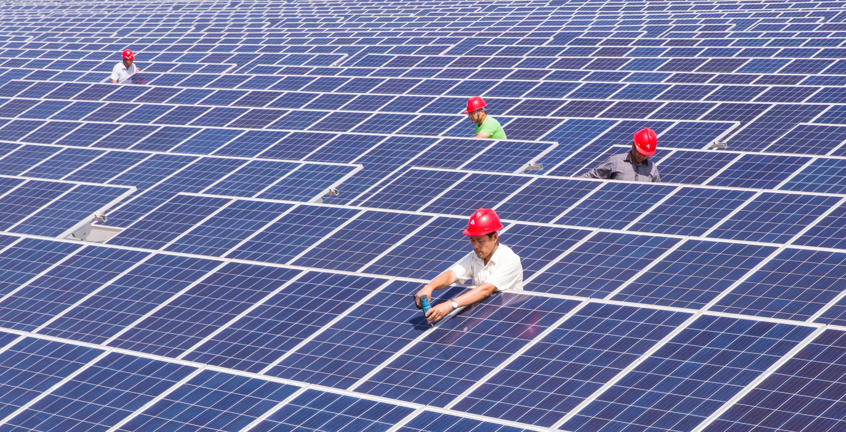Chinese workers install solar panels on the rooftop of a building at a textile factory in Nantong city, east China's Jiangsu province. Image: IC Photo via Deposit Photos