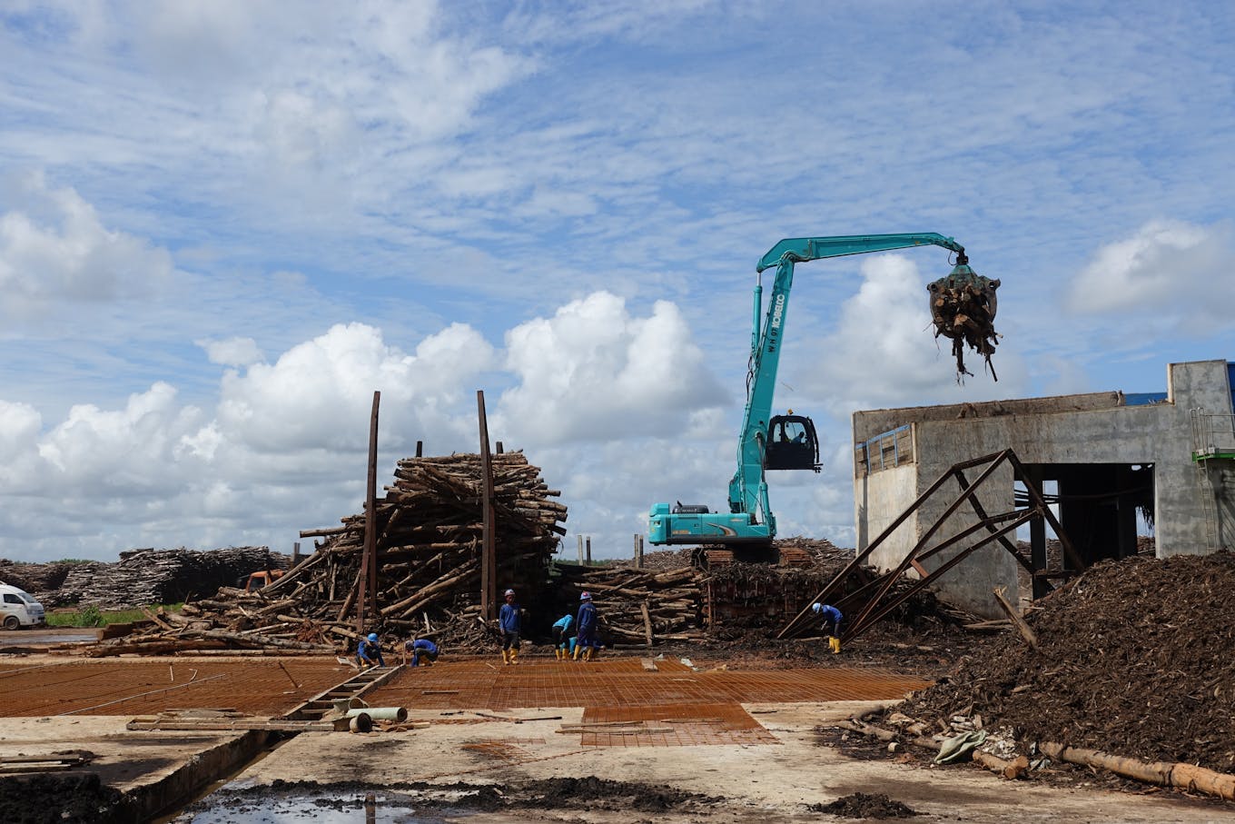 Gadang Hartawan, vice director and head of external relations at OKI, walks through the middle of OKI’s expansive wood storage area.