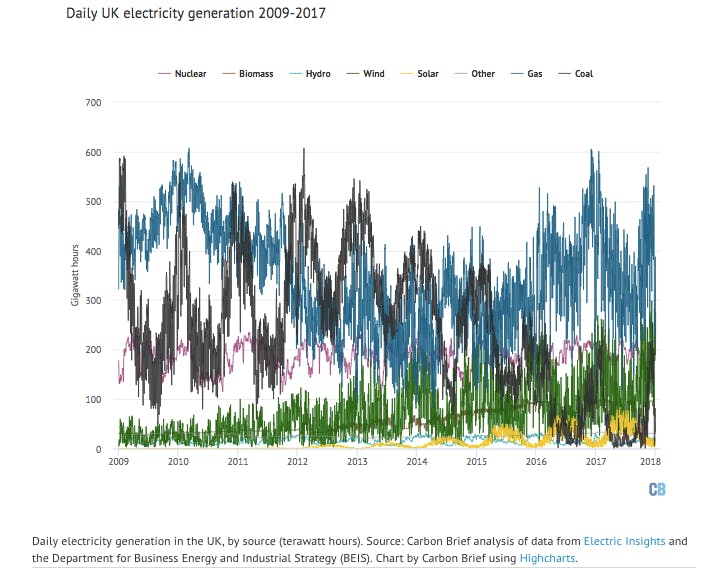 Last year, Carbon Brief’s analysis revealed that windfarms had generated more electricity than coal in 2016. This year’s analysis is based on a combination of data sources, chiefly half-hourly electricity generation data compiled by Dr Iain Staffell, lecturer in sustainable energy systems at Imperial College London, for the Electric Insights website. See the notes at the end for more on how the analysis was done.