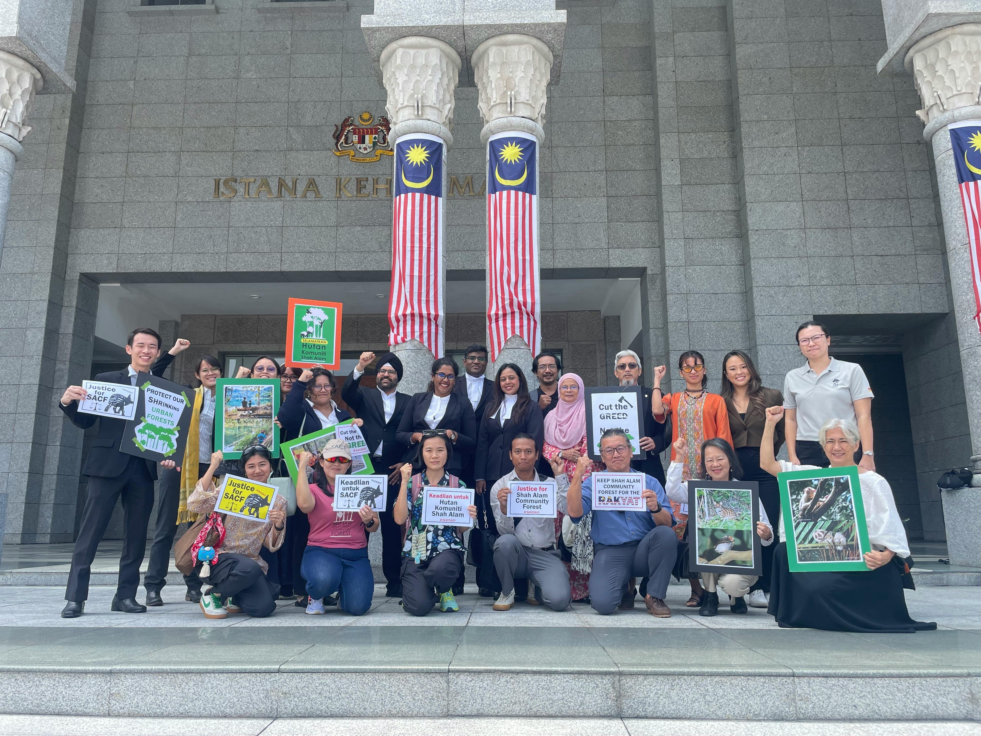 Representatives of the Shah Alam Community Forest Society, their lawyers and supporters from environmental advocacy groups in Malaysia react to the Federal Court's decision to hear their appeal against the backdated degazettement of a forest reserve. Image: Samantha Ho/Eco-Business