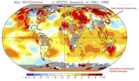 Gavin Schmidt, the director of NASA’s Goddard Institute for Space Studies, which maintains NASA’s global temperature database, explained the Chinese data glitch: