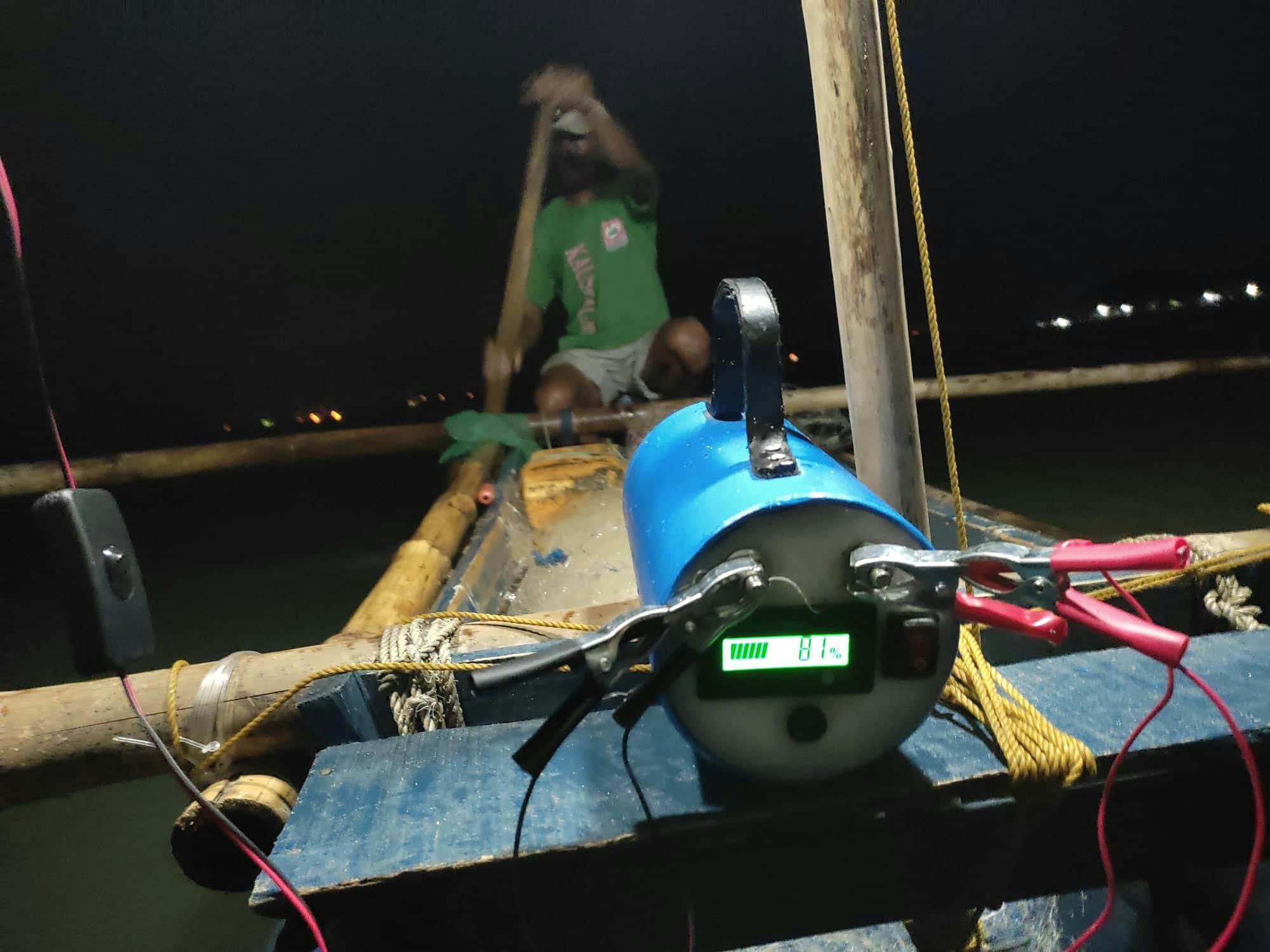 A solar-powered battery called a "power tube" is used by a fisherman as an alternative to expensive car batteries traditionally used for lighting. Startup Shifttech Marine came up with the idea after learning of the plight of local fishermen in the coastal areas of Cagayan de Oro who could not afford the car batteries. Image: Shiftech Marine