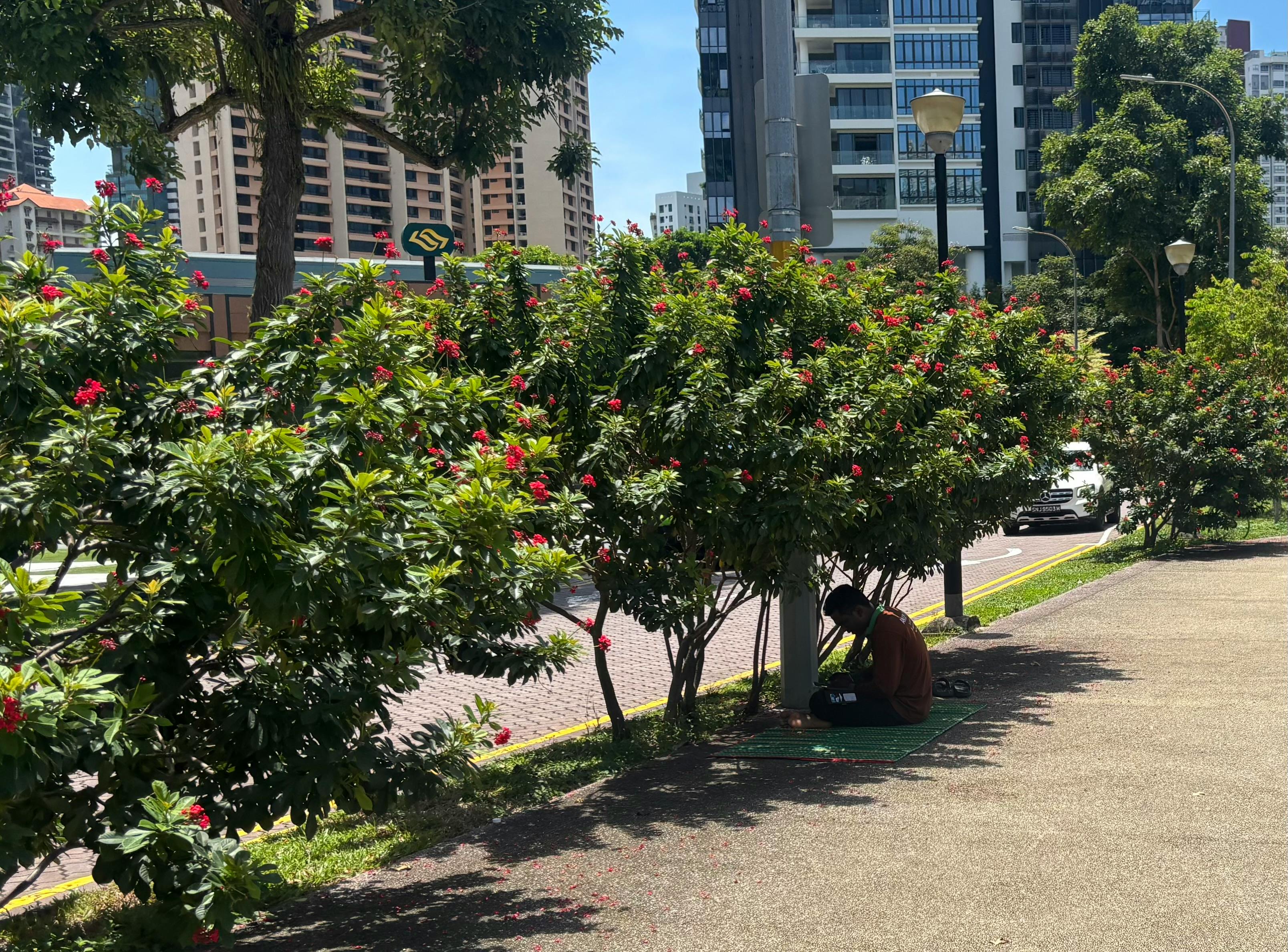 A man shelters from the midday heat on a path in Robertson Quay, Singapore. The city has established a heat resilience policy office to manage rising incidences of extreme heat. Image: Robin Hicks / Eco-Business