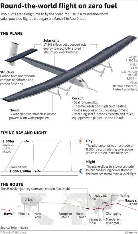The aircraft, piloted alternatively by Swiss explorers Borschberg and Bertrand Piccard, set off on its 22,000-mile (35,000-km) journey around the world from Abu Dhabi on March 9.