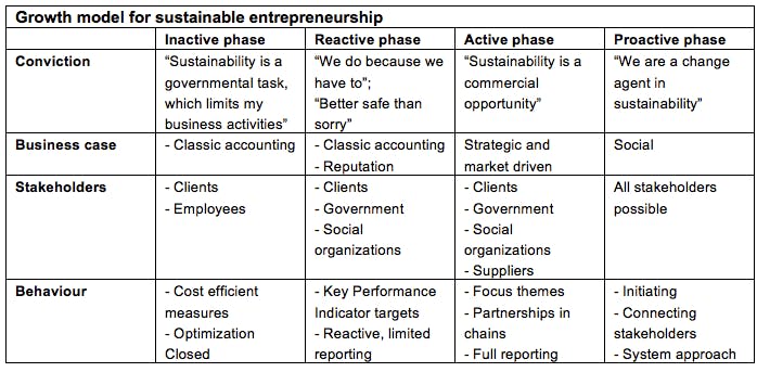 Meanwhile, the table below helps companies to classify where they are right now in terms of sustainable entrepreneurship or corporate social responsibility and where they would like to be in a couple of years.