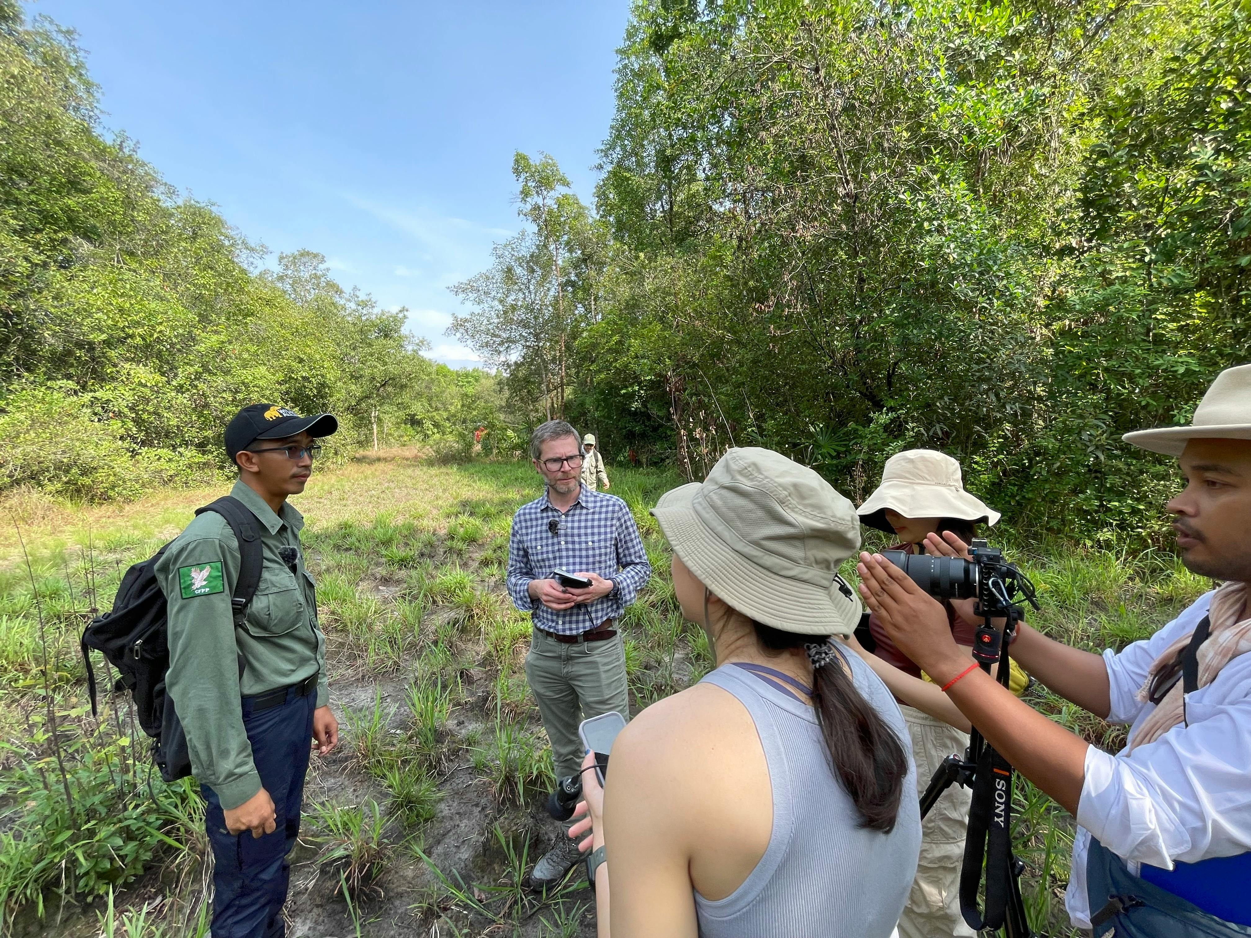 Journalists interviewing Rethy Sowath, a Wildlife Alliance ranger station supervisor in the Southern Cardamom REDD+ project. Image: Eco-Business/Gabrielle See