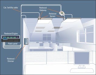 A central engine delivers power to all lights within CommScope’s Redwood Intelligent Lighting Network solution, with a gateway that collects data from sensors located next to each light.